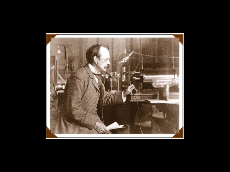 Joseph John Thomson, an English physicist usually known as J.J., was born Dec. 18, 1856 (first image). In 1884, Thomson, only 28 years old, was named the Cavendish Professor of Physics at Cambridge University. The Cavendish Lab had been founded just ten years earlier (second image). Its first director was James Clerk Maxwell, the great theorist of electromagnetism, so Thompson was stepping into some size triple-E shoes, and he managed to fill them quite respectably. In the 1890s, Thomson turned his attention to cathode rays. Cathode rays had been discovered in the 1870s by William Crookes, who invented something called a "Crookes tube." This long clear-glass tube was about the size and shape of a two-legged dachshund, with two electrodes inside. If one evacuated the tube, leaving just a little gas behind, and connected the electrodes to a battery, then the tube would glow, indicating that something was being emitted from the cathode (the negative electrode). A caricature of Crookes from Vanity Fair shows him holding one of his tubes (third image). We would call it today a cathode-ray tube.