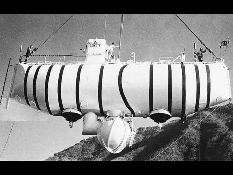 Jacques Piccard, a Swiss engineer and oceanographer, was born July 28, 1922. Piccard's father, Auguste, was a famous aeronaut, having several times set the altitude record in a balloon in 1931, and Piccard chose to go the other direction and plumb the depths of the sea. His father had designed a special submersible vehicle called a bathyscaphe that could withstand the pressures of the deep. In 1953, a version was built in Italy that was named Trieste (first image). Jacques became its principal pilot. The Trieste had a thick-walled observation sphere at the bottom, for the crew of two, and the rest of the vessel was made up of buoyancy tanks filled with gasoline. The second image shows a close-up of the observation sphere with its single Plexiglas window; the hopper-like device in front was filled with iron shot that would be released to initiate ascent.