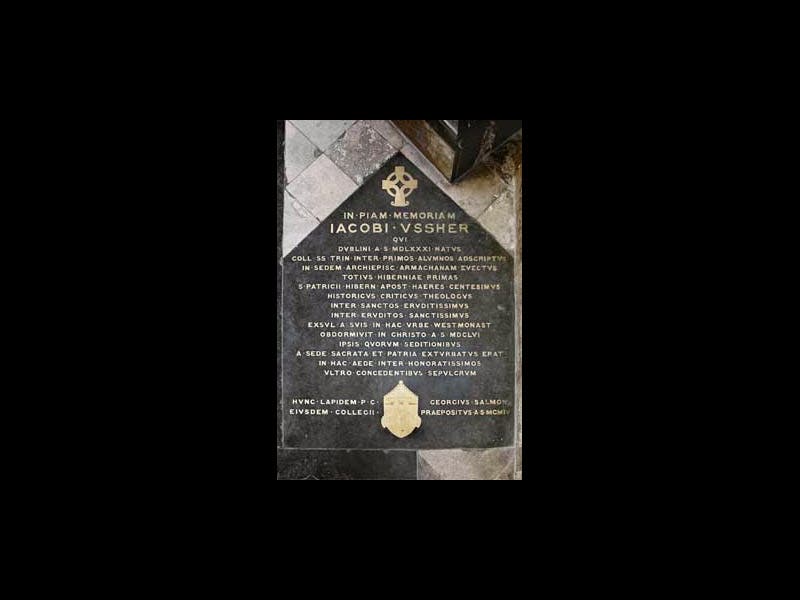 There is a fine portrait of Ussher in the National Portrait Gallery of London, presenting a wise and congenial visage that suggests we should not rush to judgment (second image). There is also a stone likeness in St. Anne’s Cathedral in Belfast, where Ussher sits atop a pillar and keeps company with Augustine and Athanasius. Ussher was buried in Westminster Abbey, where there is an informative gravestone (if you read Latin) (third image).