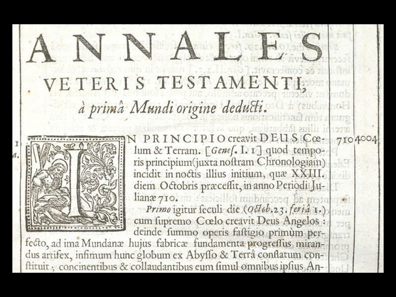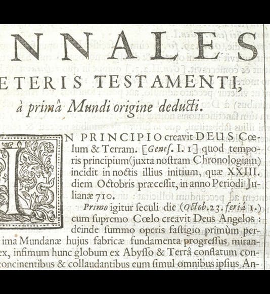Archbishop James Ussher, an Irish cleric, was born Jan. 4, 1581. Ussher was quite a respectable scholar, but he is remembered today primarily for the first paragraph of his Annales Veteris Testamenti (Annals of the Old Testament, 1650) and its marginal note. The Annals was essentially a learned commentary on Scripture, and after quoting the first verse of Genesis ("In the Beginning, God created heaven and earth"), Ussher commented: "which beginning of time, according to our chronology, occurred at the beginning of the night which preceded the 23rd of October in the year 710 of the Julian period." In the margin, he noted the Julian year and then converted it to its equivalent in the Christian calendar: 4004 BC (first image).