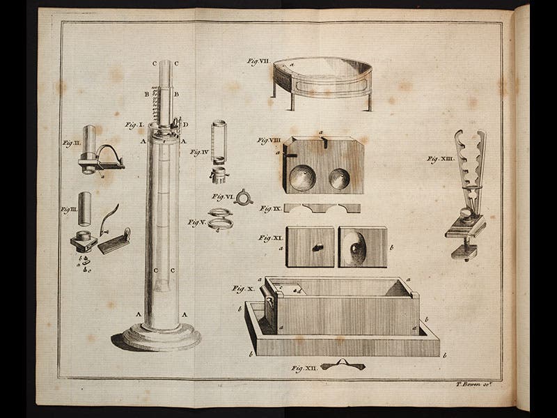 We have Ingenhousz's Experiments upon Vegetables in the History of Science Collection (second image). There is only one plate in that volume, which illustrates Ingenhousz’s experimental apparatus (third image). Much of his experimenting took place at Bowood House in Wiltshire, the estate of the Marquis of Landsdowne, whom Ingenhousz apparently served briefly as tutor. Interestingly, he succeeded Joseph Priestley at that position, and Priestley discovered oxygen in the very room where Ingenhousz deduced that oxygen is produced by green plants in sunlight.