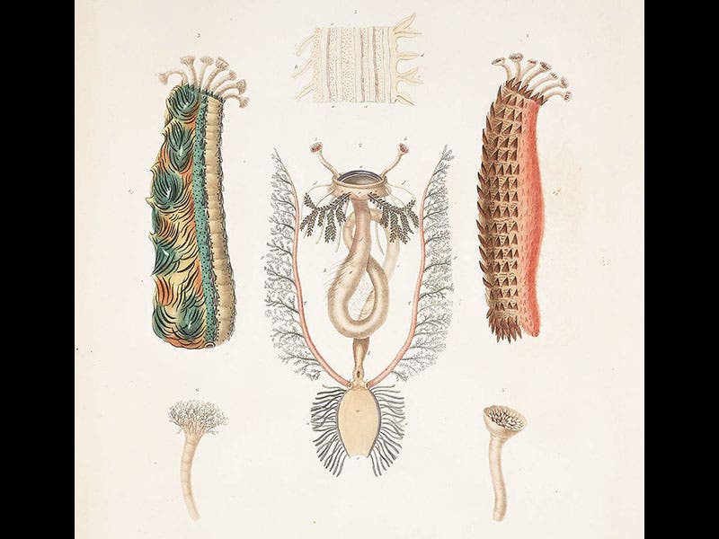 Because these illustrations seem to exemplify the "Grandeur of Life," we included one of the Zoology plate volumes in our 2009 exhibition by that name, where we opened it to a plate depicting several sea hares. You can see the entire plate above (sixth image), and a detail of one sea hare (and an anemone) if you visit the online catalogue.