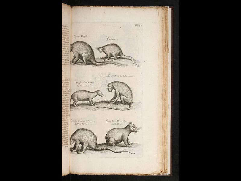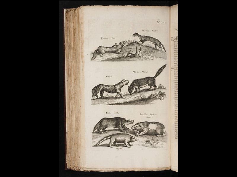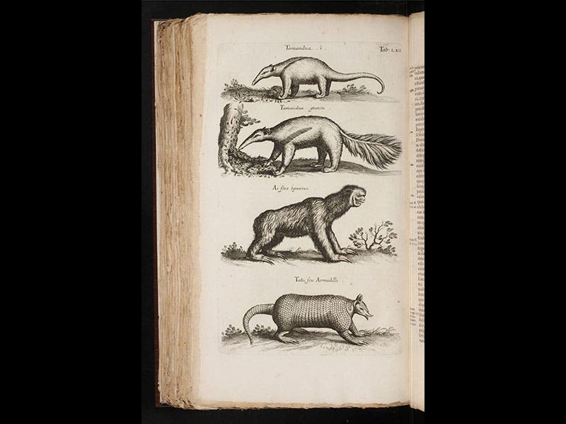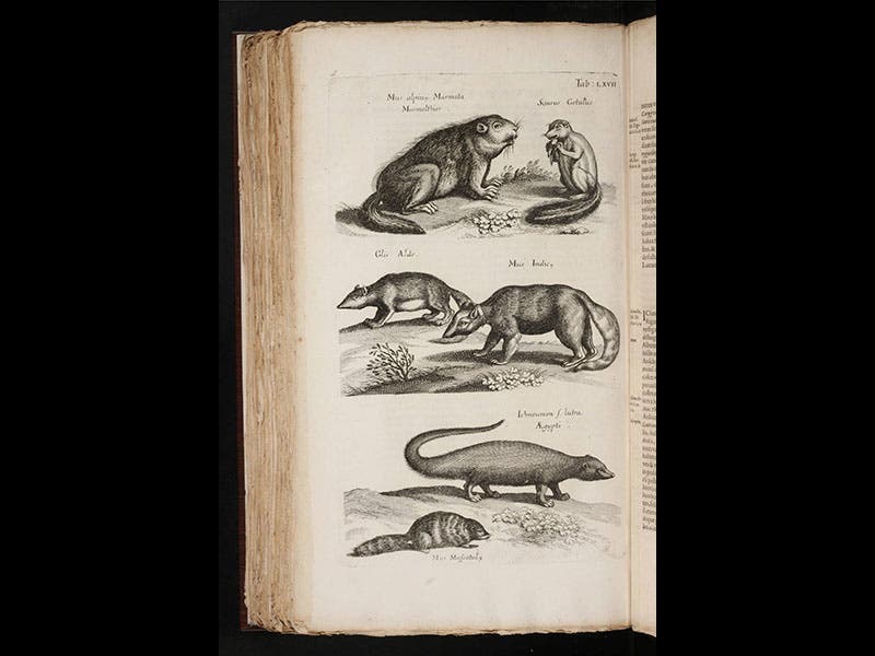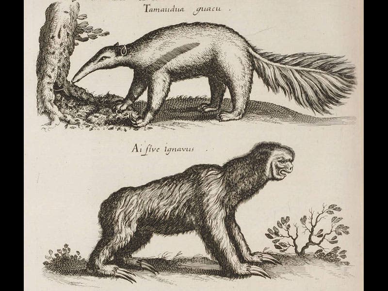 Joannes Jonston, a Polish naturalist descended from a noble Scottish family, was born Sep. 15, 1603. In 1650, Jonston published the initial volume of his Historia naturalis, the first new natural history encyclopedia since Ulisse Aldrovandi began issuing his Natural History in 1599. Jonston’s was one of the first zoological encyclopedias to utilize engravings instead of woodcuts, and the reader is treated to splendid views of badgers and polecats (second image), raccoons and ichneumons (third image), as well as newly discovered South American mammals such as howler monkeys and capybaras (fourth image), and anteaters and sloths (first and fifth images).