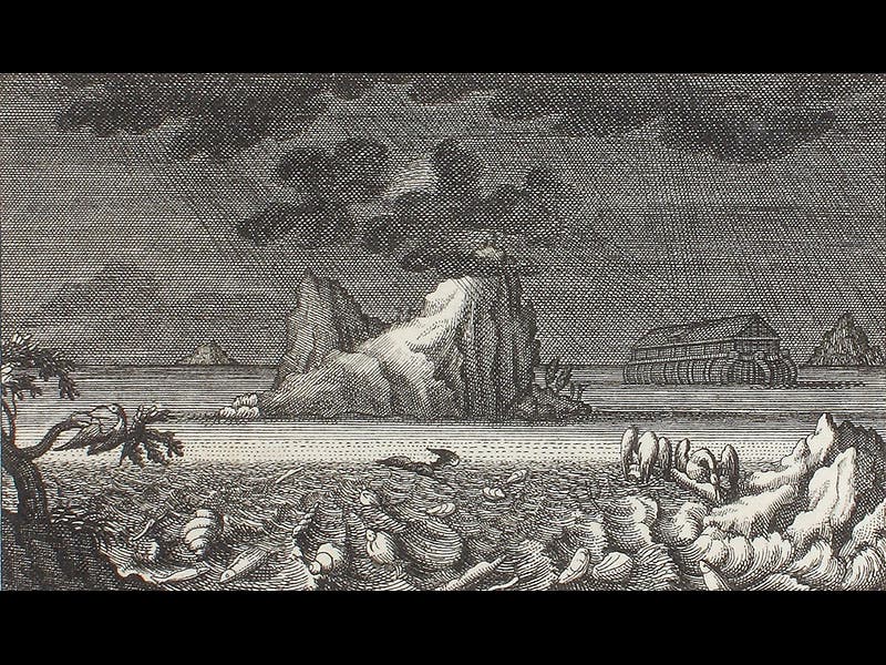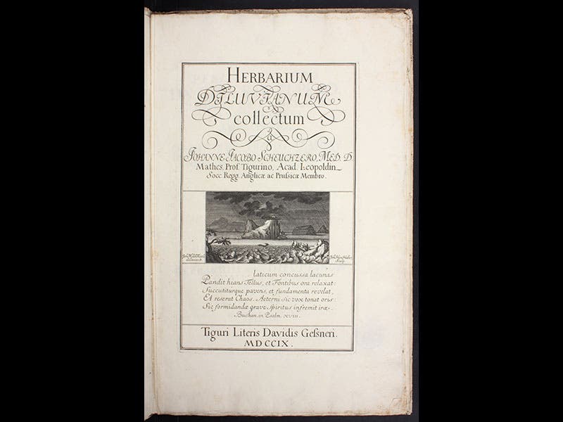 Scheuchzer believed, following the English geologist John Woodward, that all fossils--plant and animal—were deposited in the aftermath of the Great Flood. His book on fossil plants, Herbarium diluvianum (1709; first image), not only has a revealing title (Plants of the Flood), but it begins with a title-page vignette demonstrating the role of the Flood in creating fossils (second image). Geologists who attributed a major geological role to the Great Flood were later called diluvialists.
