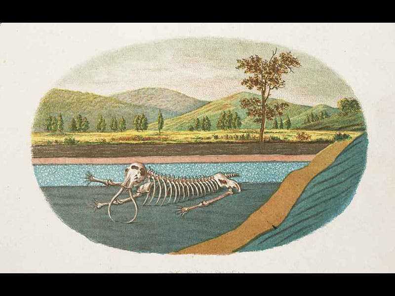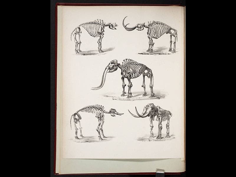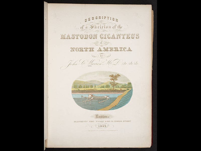 John Collins Warren, a Boston surgeon, died May 4, 1856, at the age of 77. Although Warren is well known for presiding over the first operation that used ether anesthesia, and later became Dean of Harvard Medical School, we note today his passion for mastodons. When a complete mastodon skeleton was unearthed in upstate New York in 1845, Warren bought it and had it articulated. He then wrote a book in which he compared his own mount to the four previous skeletons then known; he was no doubt proud of the fact that his own was the largest of them all. The book, called The Mastodon Giganteus of North America (1852) is in our History of Science Collection, and we displayed it in our 2013 exhibition on lithography, Crayon and Stone.