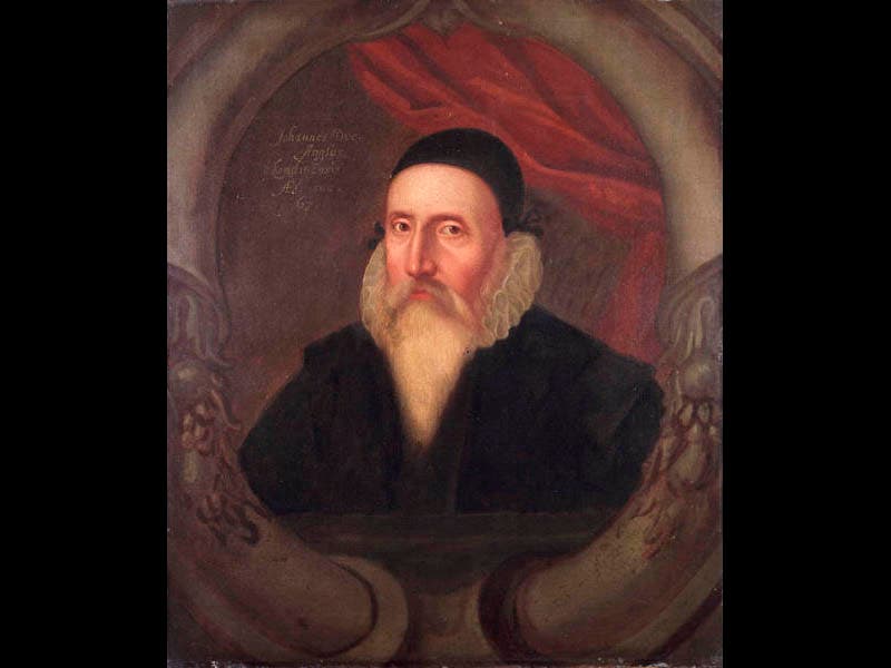Last summer, in this space, we ran a profile of John Day, the publisher of Dee’s Euclid, who introduced pop-up figures into geometry. The portrait of Day in that work is sometimes confused for that of Dee, especially since they shared the same initials: “I.D.” There is a true portrait of Dee in the Ashmolean Museum at Oxford (first image).