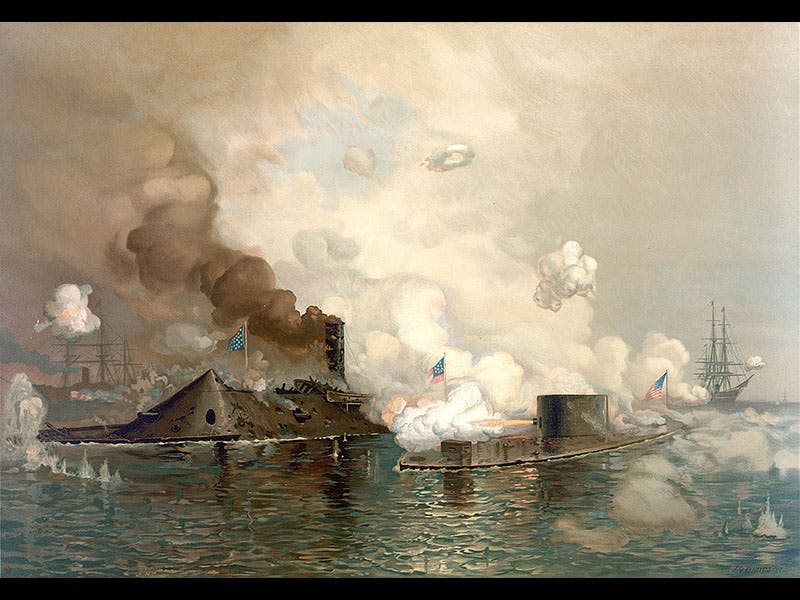 On Mar. 9, 1862, the ironclad ship USS Monitor showed up at Hampton Roads, Virginia. The previous day, the ironclad confederate ship Virginia (formerly the Merrimac before acquiring her iron epidermis) had destroyed several U.S. Navy ships, but when the Monitor joined the fray the next day, the Virginia had a worthy challenger. The Battle of Hampton Roads, as it is called, was essentially a stalemate, since neither ship could sink the other, but notice was served by both sides that the nature of naval combat had changed (see first image above). Both navies immediately quit building wooden-sheathed warships in favor of ironclads; the wooden gunship was suddenly a thing of the past.