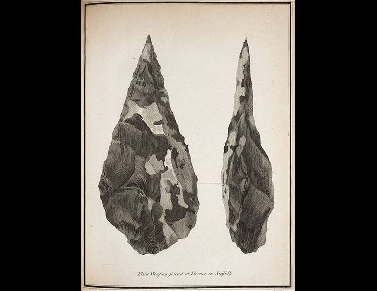 One of the flints found by Frere is still on display in the British Museum (fifth image; it is the hand axe on the right). A watercolor drawing of a Hoxne flint, made in 1797 by Thomas Underwood and used for one of Frere’s plates in his 1800 paper, is in the library of the Society of Antiquaries in London (sixth image).