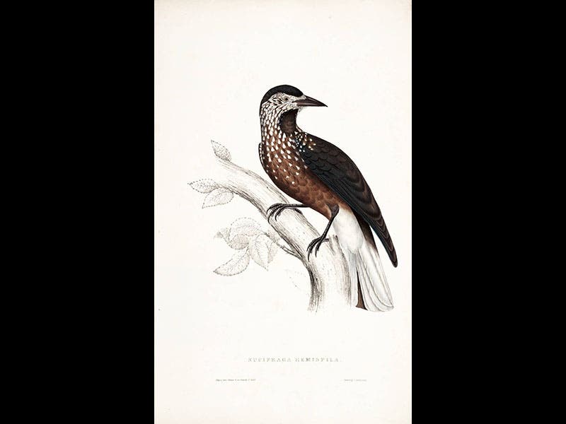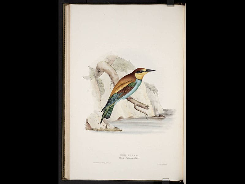 John Gould, an English ornithologist, was born Sep. 14, 1804. Gould was a skilled taxidermist and a competent sketch artist who had the good fortune to marry an even more talented artist and budding lithographer, Elizabeth Coxen Gould. In 1830, he and Elizabeth collaborated on their first bird book venture, a large folio volume called Century of Birds from the Himalaya Mountains. The book was issued in parts to subscribers, four plates per month for 20 months, finishing in 1832. It was a great success, and was followed by the five-volume Birds of Europe (1837), also issued by subscription. Over the course of fifty years, Gould and his artists (Elizabeth died in 1841) issued 50 large volumes containing over 3000 hand-colored lithographed plates. Our History of Science Collection has a respectable Gould collection, including both of the titles mentioned here, but the nearby Spencer Library at the University of Kansas in Lawrence has what must be the best collection in the world--all of Gould's published volumes, plus thousands of his and Elizabeth's drawings, lithographic transfers, even some lithographic stones.