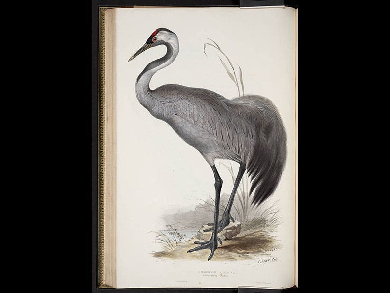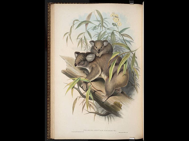 The first four images above are from the Birds of Europe, and show, in order: a bee-eater, a detail of the bee-eater plate, a common crane (drawn by Edward Lear), and a water ouzel. The nutcracker (fifth image) is from the Birds of the Himalayas, and the koalas are from Mammals of Australia (1863). We displayed several Gould volumes in our 2009 exhibition, The Grandeur of Life, where you can see a great heron and a blue roller from Birds of Europe, and a numbat and Tasmanian devil from the Mammals of Australia. The home page of this exhibit also employs one of Gould’s koalas, to happy effect.