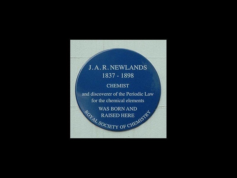 After Mendeleev had published his arrangement and was subsequently praised for being the discoverer of the periodic table, Newlands lobbied hard for credit for devising the first periodic table, and he even republished all his Chemical News contributions in a little book, On the Discovery of The Periodic Law (1884), that we have in our Collections. But the Chemical Society (now the Royal Society of Chemistry) refused to take up his cause. It was not until 1998, on the centennial of his death, that a blue plaque was finally placed on his birthplace, proclaiming Newlands “discoverer of the Periodic Law for the chemical elements.”