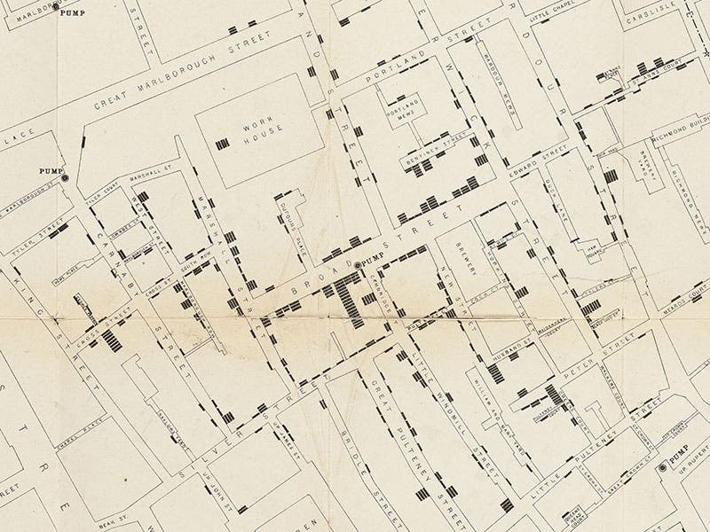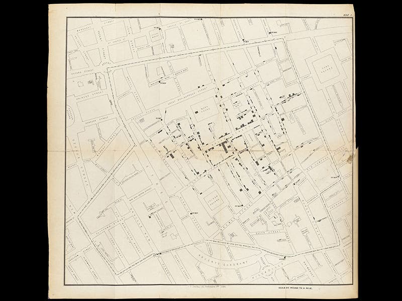 John Snow, an English physician, was born Mar. 15, 1813. In 1854, London was suffering through yet another cholera epidemic. Snow had long suspected that cholera is not caused by “miasmas” (air-borne infections), but rather by contaminants in the water supply. During this epidemic, which began on Aug. 31 and produced hundreds of fatalities, Snow started plotting incidents on a map, with each dot (actually, a small rectangle) representing a death from cholera (second image). This new kind of statistical map, now called a spot map, showed that the cholera cases were concentrated around a public water pump on Broad Street. If the water in the pump were contaminated by fecal material, that would explain the clustering of fatalities near the pump.