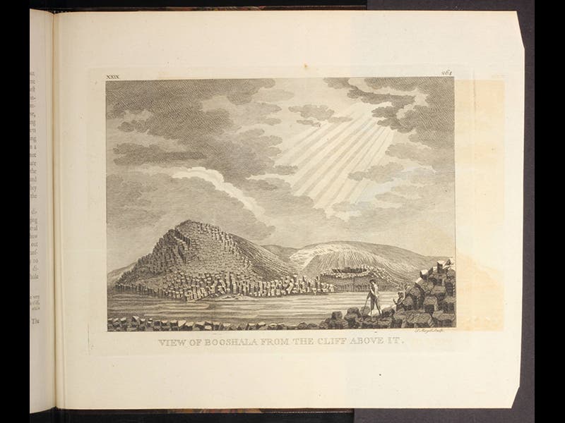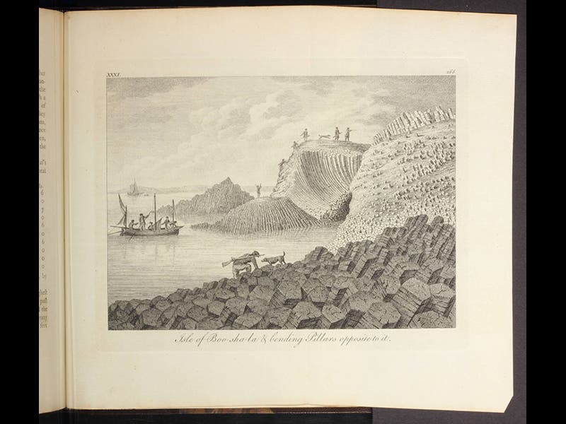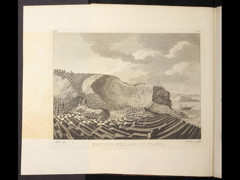 Thomas Pennant made his own tour of the Hebrides at about the same time but did not get to Staffa, so for the published account of his travels, Banks allowed him to use five of his drawings. We see all five above, as engraved for Pennant’s A Tour in Scotland, and Voyage to the Hebrides (1774). It was fortunate than Pennant included Banks’ account, because Banks never did get around to publishing his own narrative of his voyage to Iceland (and the Hebrides). The images show, in order, Fingal’s Cave, Staffa from a distance, bending basalt columns on Staffa, and two views of Booshala.