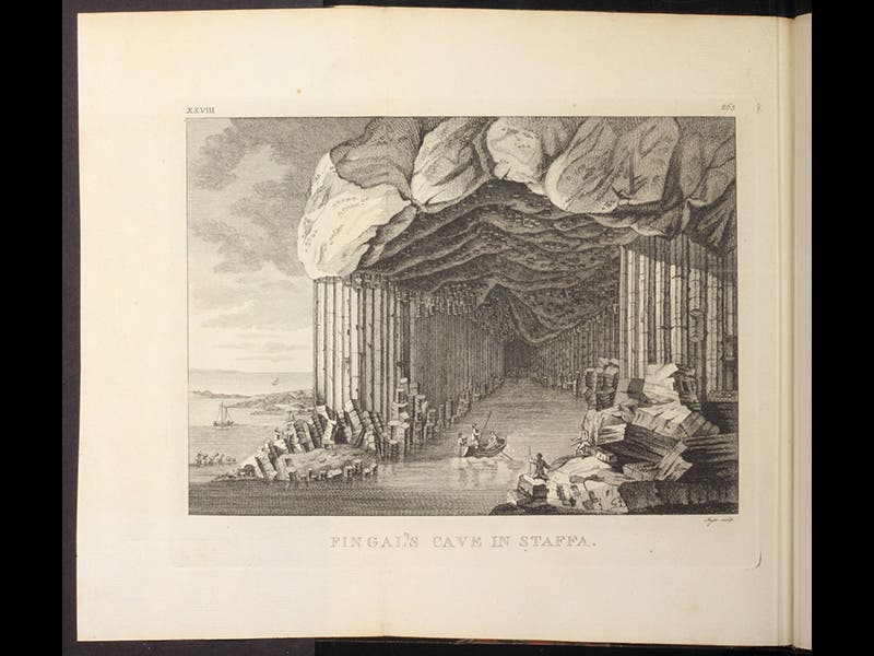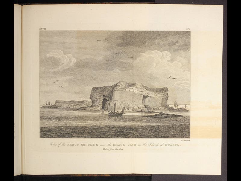 Joseph Banks, an English botanist and explorer, was born Feb. 13, 1743. Banks had accompanied James Cook on his first voyage around the world, from 1768 to 1771, and had planned to be part of the second voyage, but the two had a falling out, and Banks in a huff headed instead for Iceland with a small party. On the way, they stopped in Scotland’s Inner Hebrides, and Banks became the first Londoner to visit the isle of Staffa and the nearby islet of Booshala (now Am Buachaille) and to view the striking basalt formations there. Banks was particularly enthralled by a large basalt cavern that the locals called Fingal’s Cave. He had brought an artist along, who made drawings of the cave, of Staffa, and of Booshala.