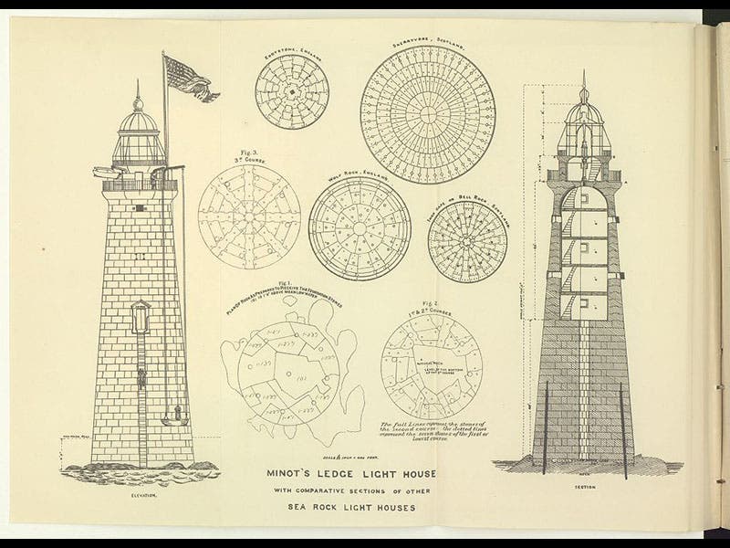 General Joseph Gilbert Totten, an American civil engineer, was born Aug. 23, 1788 (fourth image). Totten had been chief engineer of the U.S. Army for some years when he was called upon to design a new lighthouse for Minot's Ledge, a tiny shelf of rock on the southeast rim of Boston Harbor, about 1 mile north and offshore of the towns of Minot and Cohasset (second image; Minot and Cohasset are in the extreme lower right corner of the map). The area was quite dangerous to shipping, and so a beacon of some sort was necessary, but the first lighthouse, an iron structure that was put in place in 1850, lasted for only one year before storms tore it (and its two helpless keepers) from the rocks (third image). Totten was assigned to design a replacement, and he took his cue from the Eddystone lighthouse, built almost exactly a century earlier in the English Channel. Inspired by Eddystone, Totten decided that Minot's Ledge needed a stone structure, with the stones dovetailed together and further strengthened by iron rods, and kept in place by its own massive weight (see a series of elevations and sections, fifth image). The problem is that Minot's Ledge is underwater most of the time, and the initial work could only be accomplished at low tide from a heaving ship.