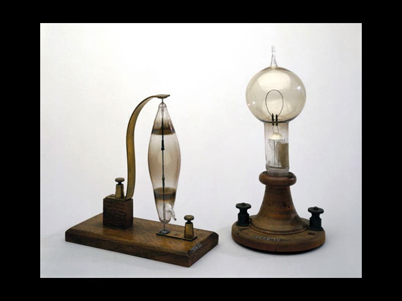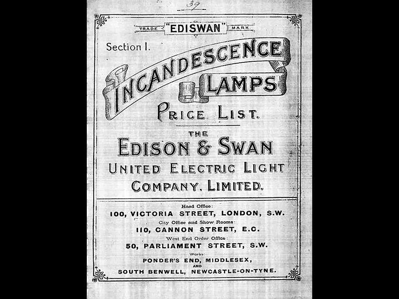 In 1880, Swan began manufacturing light bulbs. The Edison people came over to England and threatened a lawsuit for patent infringement, and quickly discovered that they had no grounds, and that if they pursued a suit, the Edison patents would almost certainly be invalidated, since Swan's work preceded his. So instead of suing Swan's company, they merged with it, forming the Edison and Swan Company, which manufactured bulbs, using the brand name Ediswan, right up until the 1930s (third image).