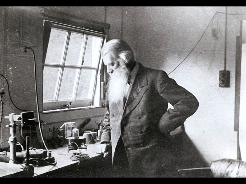 Joseph Wilson Swan, a British inventor, was born Oct. 31, 1828. In 1979, the organizers of the “International Centennial of Light” in the United States, preparing to celebrate the 100th anniversary of the invention of the light bulb by Thomas Edison on Oct. 21, 1979, were a bit surprised to learn that the British were organizing their own "Electric Lamp Centenary,” and that they were honoring not Edison, but Swan. The English festivities were to begin almost 8 months earlier, on Feb. 3, 1979, commemorating the date that Swan demonstrated his light bulb to an audience in his home city of Newcastle-on-Tyne. Swan, it turns out, had been trying to develop an electric bulb since 1845. Unlike Edison 30 years later, Swan avoided metal filaments, because they fused and burned up. By 1855, Swan had settled on carbon as the ideal filament. But because vacuum pumps were not very good in 1855, the carbon filaments oxidized and burned out much too quickly. Swan gave up and turned to photography, inventing the carbon print photographic process in the 1860s and manufacturing dry photographic plates in the early 1870s. Meanwhile, someone finally invented a decent vacuum pump, and in 1877, Swan returned to his light bulb experiments. Now the carbon filaments in his high-vacuum bulbs continued to glow for a long time. He demonstrated his light bulb to a crowd of 700 in Newcastle on Feb. 3, 1879, and then went out and electrified his house, and then an entire street in Newcastle. We see above a photo of Swan in his Newcastle lab, taken about this time (second image).