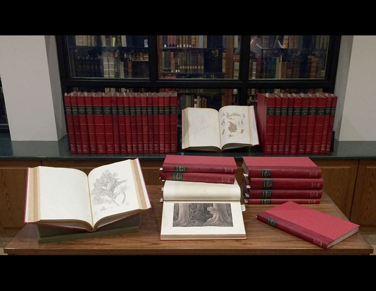 Karl Friedrich von Martius, a German botanist, was born Apr. 17, 1794. As a young man, Martius became a favorite of the King of Bavaria, and was sent by him in 1817 on a collecting expedition to Brazil. His companion was a zoologist, Johann von Spix. When they returned three years later, Martius had enough plants, seeds, and descriptions to occupy him for the rest of his life. The living plants went into the Bavarian Botanic Garden in Munich, but the dried specimens became the fodder for the truly monumental Flora Brasiliensis, which Martius began in 1840. By the time of his death, he had issued 46 fascicles; the entire work, comprising of 130 fascicles, was completed in 1906. The set is so impressive that we decided to pose all 40 of the red half-morocco volumes outside our Rare Book Vault for a group picture (first image above).