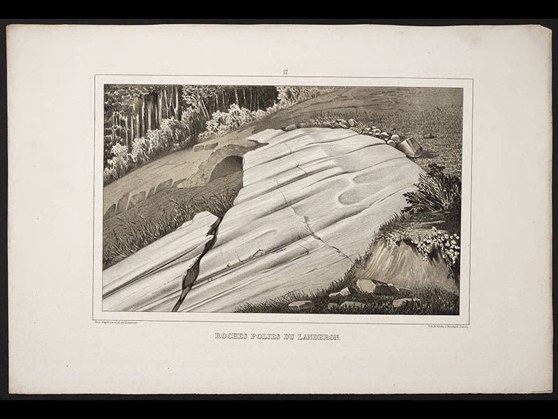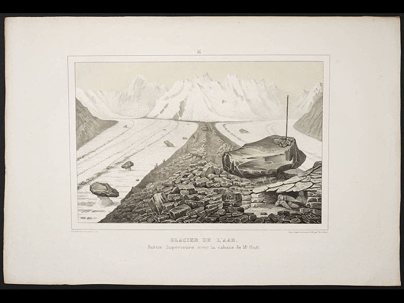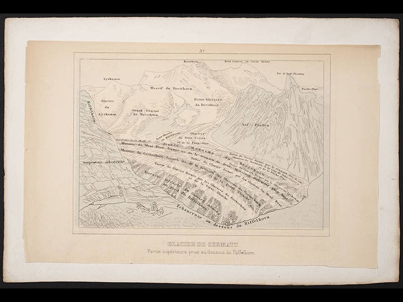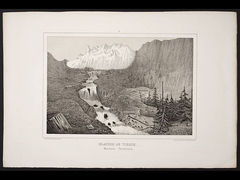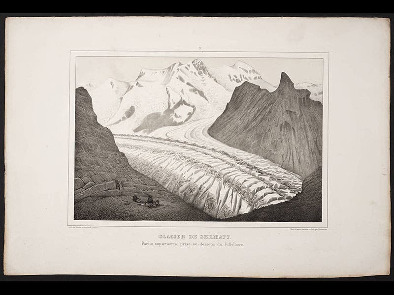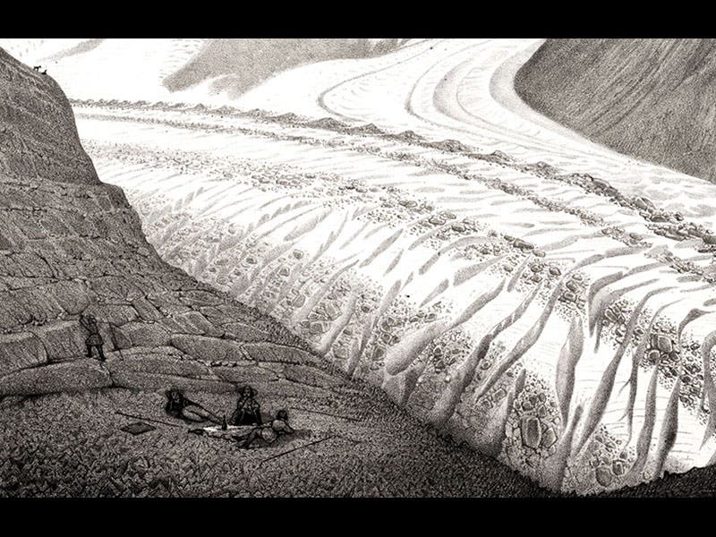 Louis Agassiz, a Swiss naturalist, was born May 28, 1807. In 1837, Agassiz first suggested to a scientific audience that Europe had once been covered by massive ice sheets, and in 1840 he published his Études sur les glaciers, a detailed and illustrated account of modern glaciers in Switzerland. In revealing the characteristic signs of glacial activity--striated rocks, lateral and terminal moraines, erratic boulders--he made it possible for geologists in other areas, such as Scotland or Wisconsin, to recognize similar markings and realize that their countries had once experienced extensive glacial activity. His book was accompanied by an Atlas with a number of dramatic lithographs of Alpine glaciers, such as the Zermat glacier (see first image above) and the Finsteraar glacier (second image). Rather than clutter the images with labels, Agassiz instead used tissue paper overlays with all the names and terms printed on the tissue (third image, the overlay for the Zermat glacier). The plates include many amusing vignettes that invite a closer look; our fourth image shows a detail of the first image, where you may see picnickers enjoying an afternoon near the ice. The fifth image shows a striated rock, a sure sign that a glacier passed over at some time in the past, and the last depicts the Viesch glacier with a prominent terminal moraine, another clear indicator of the former presence of a glacier. We displayed Agassiz's Études sur les glaciers in our 2008 exhibition, Ice: A Victorian Romance, along with the original 1837 paper in which Agassiz first announced his startling thesis. Dr. William B. Ashworth, Jr., Consultant for the History of Science, Linda Hall Library and Associate Professor, Department of History, University of Missouri-Kansas City. Comments or corrections are welcome; please direct to ashworthw@umkc.edu.