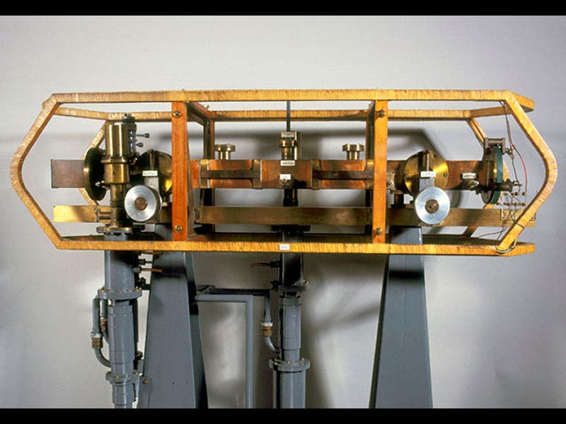 Then, in 1955, working with his assistant Jack Parry, Essen built the first atomic clock (first image; Essen is on the right). He used the frequency of the light given off by caesium 133 as the basis for the clock, and it was accurate to within one part in a billion, which is to say, his clock might lose or gain one second in 30 years. It was immediately recognized by others that the era of astronomical timekeeping was over, and that we would soon be defining the second in terms of the frequency of light, and no longer as a fraction of a solar day. And this has turned out to be the case, as the second was officially redefined in 1967. The original Essen/Parry caesium clock of 1955 is currently on display in the Science Museum, London (second image).