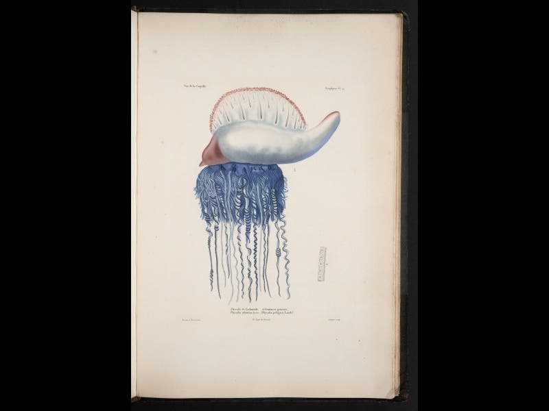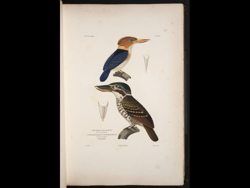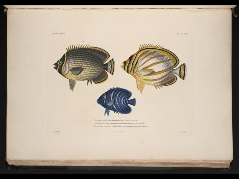 Louis Isidore Duperrey, a French naval officer, was born Oct. 21, 1786. After sailing around the world as second in command on the Uranie in 1817-20, Duperrey was given command of the Coquille in 1822, with a mission of exploring the Pacific and the islands north of Australia, such as New Guinea. The naturalists on board theCoquille were the two ship’s surgeons, Prosper Garnot and René Primevère Lesson. Duperrey himself, although trained as a hydrologist, pitched in by collecting minerals, as did Jules Dumont d’Urville, the assistant commander, who was the botanist. This quartet amassed an astonishing collection of unknown plants and animals, especially from New Guinea, including birds of paradise, bower birds, the reclusive marsupial cuscus, and a wide variety of fish and invertebrates. When the voyage concluded in 1825, Duperrey leapt into the task of publishing the narrative, and the first volume appeared before the year was out, with the other five volumes plus four large atlases following over the next five years. We have an almost complete set of this important scientific voyage in the History of Science Collection; we displayed a volume in our recent Grandeur of Life exhibition.