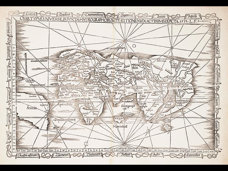 In our Library, we have a 1525 edition of Ptolemy’s Geographia, which contains a reduced and updated version of the Waldseemüller world map (fifth image above).