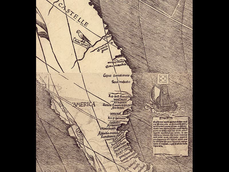 Only one copy of the map survives, and it was acquired in 2001 by the Library of Congress, where you can see it today (third image above). Waldseemüller also published a small globe in 1507 to accompany the large wall map; it was printed in the form of gores, which can be cut out and pasted on a sphere of the proper size to form a globe, and it also features the label “America” on the sliver of a new world. A sheet of 1507 gores is almost as scarce as the wall map; only three survive, and there is only one set in this country, at the James Ford Bell Library at the University of Minnesota (fourth image above).