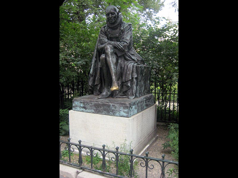 There is a statue of Montaigne in Paris, just across from the Sorbonne (first image). Students customarily rub his shoe for good luck. As superstitions go, this is not a bad one, if it keeps students continuously aware of the genius of Montaigne.