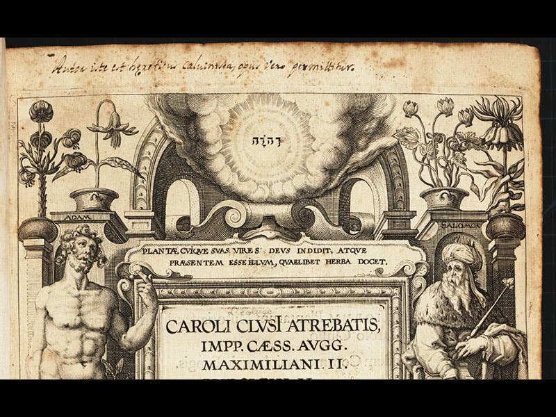 Ogier Ghiselin de Busbecq, a Flemish botanist and diplomat, died Oct. 28, 1592, at age 70. Busbecq served several Habsburg emperors in Vienna as ambassador to Constantinople. Captivated by the flowers he saw in Turkish gardens that were unknown to the West, he arranged to have bulbs and seeds sent back to his friend, Carolus Clusius, also serving the Habsburgs in Vienna, who planted them in the imperial gardens and then helped disseminate them further west. The top of the engraved title page to Clusius's Rariorum plantarum historia (1601; first image above) shows four of the plants that went from Busbecq to Clusius to Europe (from left to right): turks-cap lily, dog-toothed violet, cyclamen, and crown imperial. Not included here is the most famous import from Constantinople, the tulip (but see bottom center of the entire engraving (second image).