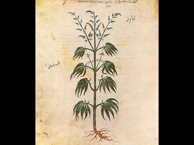 Busbecq also purchased a botanical manuscript in Constantinople that he sent back to Vienna. It was a fully illustrated copy in Greek of the De materia medica of Dioscorides, originally compiled about 60 C.E and the direct ancestor of the herbal. The manuscript was made in 512 C.E., commissioned by Princess Anicia Juliana, and it is one of the oldest scientific manuscripts in the world. It is usually referred to as the Vienna Dioscorides, or the Vienna Codex. It is important in showing us that early botanical illustrations were naturalistic, drawn from life, a characteristic that faded away in the Middle Ages and had to be rediscovered in the sixteenth century. Because the manuscript is unique—it resides in the Austrian National Library—a sumptuous facsimile was published in 1965 that managed to duplicate the look and feel of the original, which was written on vellum. We have a copy of the facsimile in our History of Science Collection. Three of the images from the Vienna Dioscorides are reproduced above: a bramble (third image), Cannabis (fourth image), and a portrait of Dioscorides (fifth image). A sixteenth-century engraved portrait of Busbecq provides our last image.
