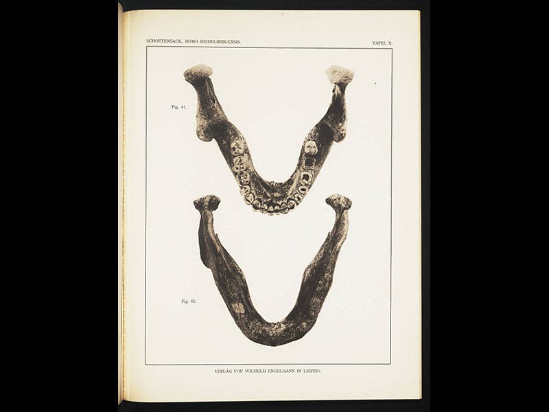 In 2012, we mounted an exhibition at the Library titled Blade and Bone: The Discovery of Human Antiquity. At the time, we did not own Schoetensack’s 1908 book, so we had to use later publications to introduce Heidelberg man and the Mauer Jaw. Last year, however, a copy of Der Unterkiefer des Homo Heidelbergensis was offered on the market, and we were fortunate to acquire it. Above we see the title page and three plates from the volume, showing side views of the Mauer jaw (third image), a top and bottom view (fourth image) and, most interestingly, a set of X-rays of the jaw (fifth image). To our knowledge, this is the first published X-ray view of any paleoanthropological object.