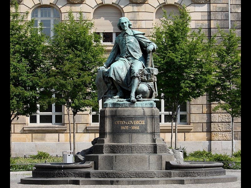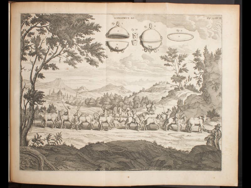 Otto von Guericke, experimental natural philosopher and mayor of Magdeburg, Germany, was born Nov. 20, 1602. In the early 1650s, when a controversy was raging as to whether there was a vacuum in the closed end of a barometric tube, Guericke set out to try to make a vacuum a different way: by evacuating the air from a container with a pump. He built the pump himself--it was similar to a modern bicycle pump, with the valves in reverse--and he also had to invent a suitable container for evacuation. He tried wooden casks sealed with pitch, but they leaked. He finally tried copper spheres, which he was able to evacuate successfully. In one of the most famous demonstration experiments of the seventeenth century, he held two copper hemispheres together to make a sphere--but did not otherwise attach them--and evacuated the air from the sphere. He then hitched each hemisphere to a team of 8 horses, and they were unable to pull the hemispheres apart. When he turned a valve and let the air back in, the hemispheres fell apart all by themselves. This demonstrated, in the most dramatic fashion, the reality of atmospheric pressure. The demonstration was depicted in Guericke’s later book, Experimenta nova (ut vocantur) magdeburgica, 1672.