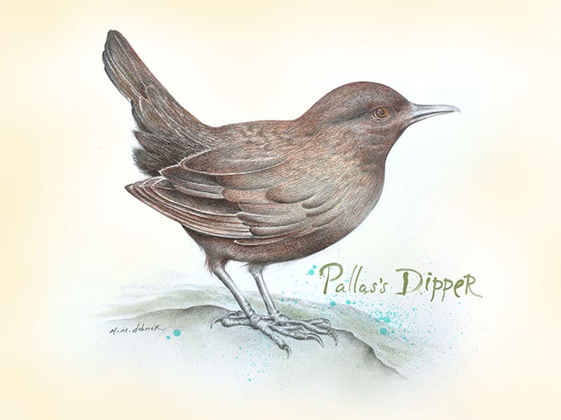 A monument to Pallas was recently erected in Russia, at the site of the meteorite fall, but we prefer to show a different monument, a bird named for Pallas in 1820 by Coenraad Temminck. Pallas’s dipper is a charming creature that frequents streams and waterfalls; the exquisite graphite drawing above was freshly sketched for this occasion by our own Melissa Dehner (first image).