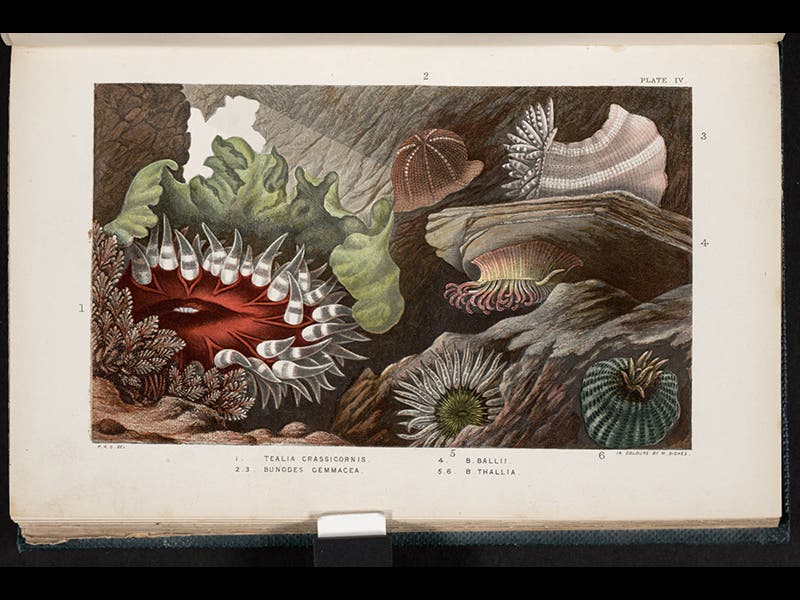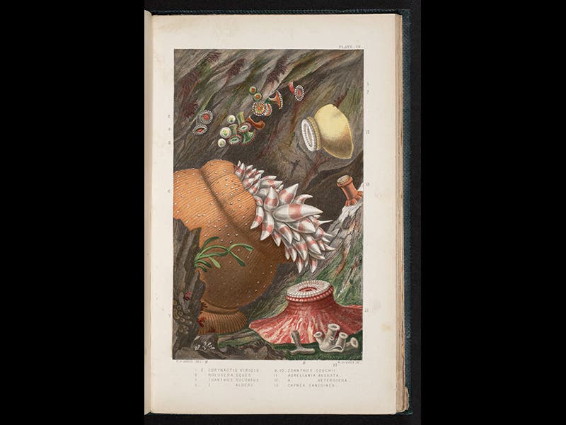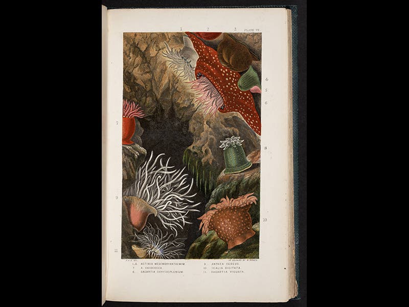 Phillip Henry Gosse, an English invertebrate zoologist, was born Apr. 6, 1810. It is not clear who invented the aquarium, but Gosse certainly was its great popularizer in the 1850s. The terrarium, a closed glass box, had been devised in the 1830s, and was used in Victorian England primarily for growing ferns. Gosse essentially turned the terrarium upside down and filled it with sea water, and made it possible to maintain and view all sorts of aquatic life in the comfort of one’s parlour. Gosse was particularly fond of sea-anemones, which come in a variety of colors and become quite active, swirling their tentacles about, when placed in an aquarium. In 1860, Gosse published Actinologia Britannica: A History of the British Sea-anemones and Corals, which has a number of beautiful plates, printed in color, of various species of anemones. The images above are taken from this book, and were all drawn by Gosse himself. We displayed the book in our 2009 exhibition: The Grandeur of Life; the online version shows two more of Gosse’s stunning plates, different from the ones above.
