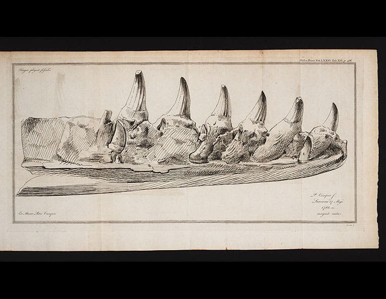 Pieter Camper, a Dutch naturalist also known as Petrus Camper, was born May 11, 1722, in Leiden. Camper was an avid collector of fossils, and in 1782 he acquired the collection of a surgeon, Jean Hoffmann. Hoffmann’s fossils had mostly been dug out of quarries at St. Pietersberg mountain near Maastricht, and included a huge jaw of an unknown animal. Camper described the specimen in a letter to the Royal Society of London in 1786 (first image) and ventured that the jaw belonged to a large toothed whale. Another specimen, this time a skull with both jaws (second image), was discovered in the same quarry and acquired by a Frenchman, Barthélemy Faujas-de-St.-Fond, who disagreed with Camper’s identification, and thought it belonged to a large crocodile. After Camper died in 1789, Faujas published a beautiful account of the fossils of St. Pietersberg, illustrating both his and Camper’s specimens with fine engravings, and adding a fanciful print showing the supposed discovery of the skull. We displayed this engraving in out 2009 exhibition, The Grandeur of Life.