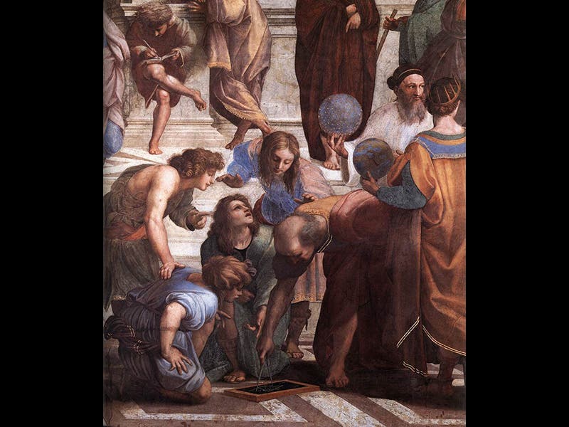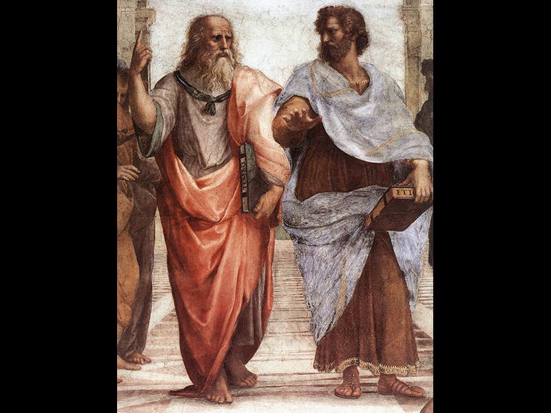 Raphael Sanzio, the great Renaissance artist, was born Apr. 6, 1483. If you dispute this date (some do), we note that Raphael died on Apr. 6 (no dispute here), so one way or the other, this is the correct day to pay tribute. Sometime between 1509 and 1511, Raphael completed one of the most famous group portraits of all time, The School of Athens. Painted in fresco on one of the walls of the Stanza della Segnatura in the Apostolic Palace of the Vatican, The School of Athens portrays the collective scientific wisdom of Greek antiquity (first image). Here one can find portrayals of Plato, Aristotle, Socrates, Pythagoras, Euclid, Ptolemy, and a host of others. Under the arch in the center, for example, stand Aristotle and Plato (second image), and we know this because Plato, on the left, clutches a copy of his book Timaeus, while Aristotle holds the Ethics. But you don’t really need to read the labels on the spines to make the identifications--Raphael has used gestures beautifully to distinguish the two philosophers. Plato points upward, to the world of forms, and Aristotle downward, to the sensible world; seldom have two philosophical schools been captured more clearly and more economically.