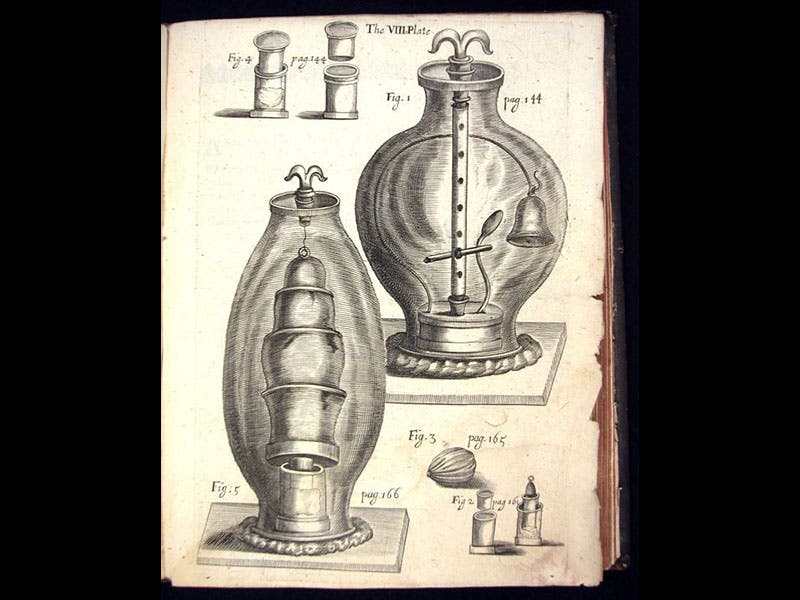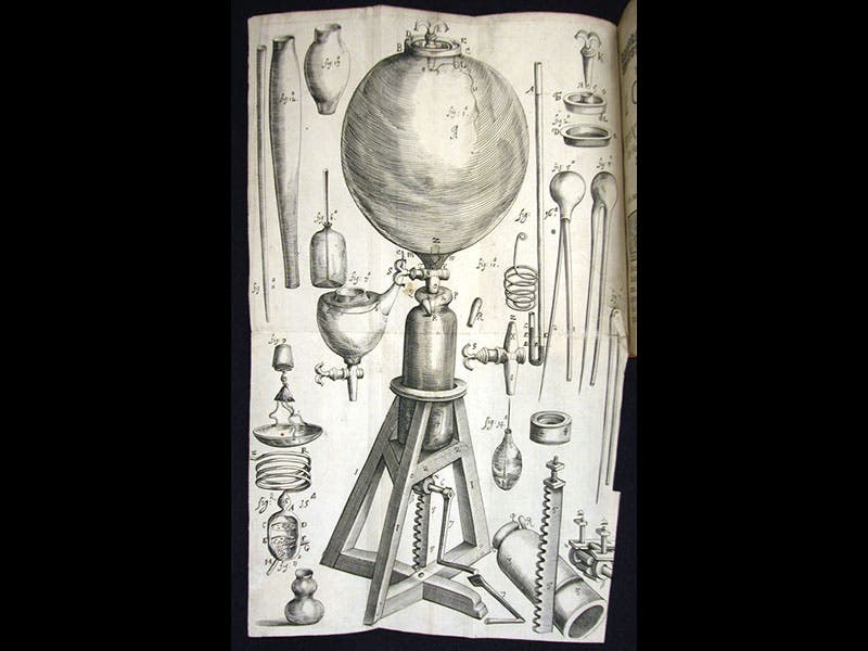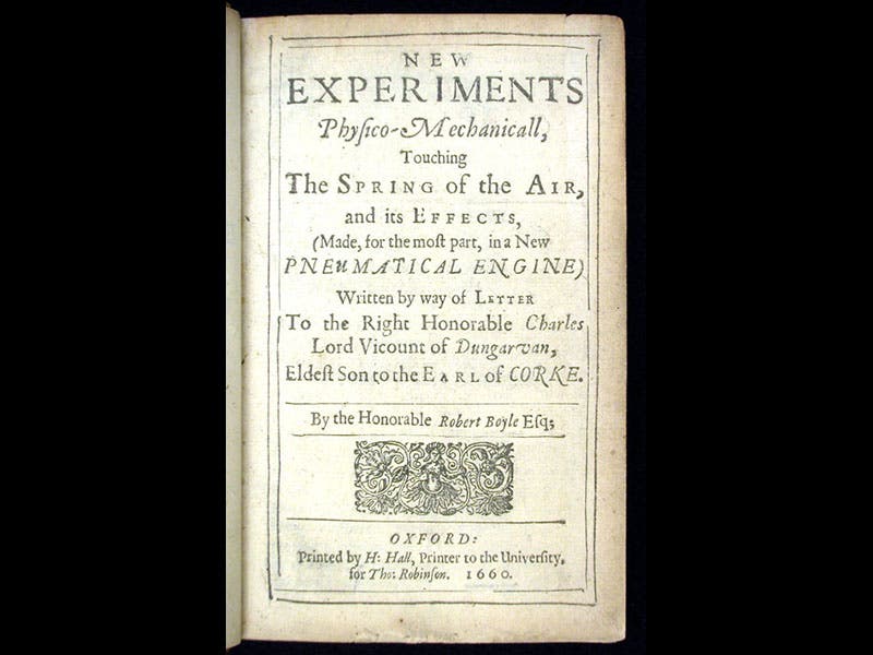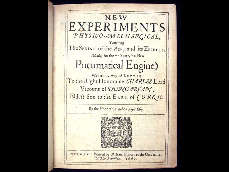 Boyle published two books on his air experiments with the same title: New experiments physico-mechanicall touching the spring of the air. The first edition of 1660, a short work, does not contain Boyle’s law, as it had not yet been discovered, but it does have an engraving of his air pump (first and fourth images); the second edition of 1662 (fifth image), which is greatly enlarged, contains the first statement of the law. We have lovely copies of both editions in our History of Science Collection. We also have Boyle’s Continuation of New Experiments (1669), which has many engravings of quite elaborate pneumatic experiments (third image).