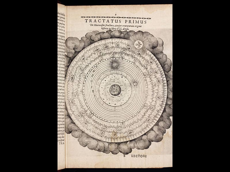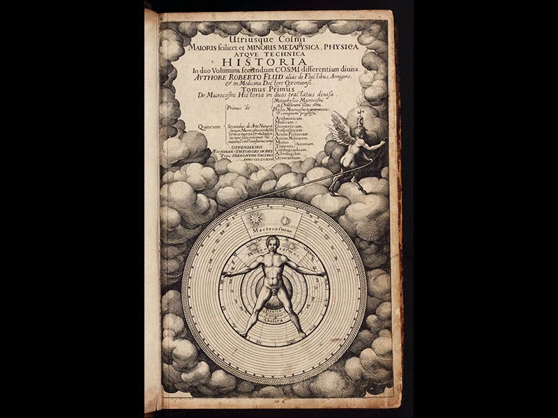 Robert Fludd, an English physician and Hermetic philosopher, died Sep. 8, 1637, at age 63 (fourth image). Fludd is best known for his mammoth encyclopedia, Utriusque cosmi maioris scilicet et minoris metaphysica (History of the Macrocosm and Microcosm, 1617-19), the last gasp of a Renaissance magical world view that envisioned an interconnected universe filled with correspondences and sympathies. The book is famous for its engraved plates that illustrate these connections, such as the wonderful title page, depicting a human form, the microcosm, overlying the planetary spheres, the macrocosm (first image). Another plate shows a three-part macrocosm, with an elemental world surrounded by celestial spheres and the nine orders of angels (second image). A third engraving illustrates a cosmic monochord, with each planet corresponding to a musical tone, demonstrating the harmony of the spheres (third image). Numerous brackets connect the elemental, celestial, and angelic realms, with labels such as “octave,” “fifth”, and “fourth” identifying the interconnecting harmonies.