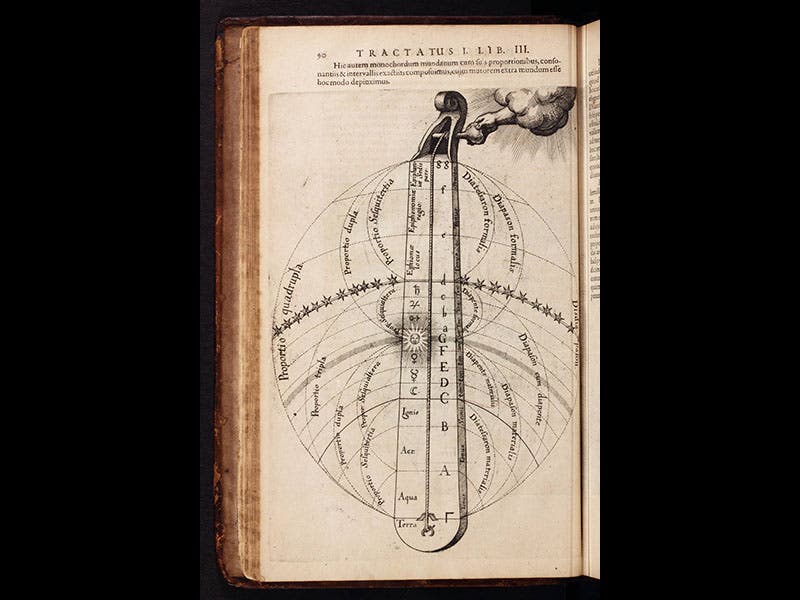 Fludd’s images drew an attack from Johannes Kepler, who at the time was completing his own Harmonies of the world (Harmonices mundi, 1619), and at the end of this work he weighed in on Fludd. Kepler discovered his harmonies by measuring such things as planetary distances and speeds, and then looking for harmonic ratios in those figures. Fludd, he argues, just made them up. Fludd’s macrocosms are attractive to behold, but if the harmonies don’t correspond to any numbers in the real world, then they are just nonsense, argued Kepler. This brief contretemps epitomizes the difference between the Renaissance and the 17th century world views, the one proposing correspondences everywhere, the other insisting that a correspondence not grounded in a physical measurement is a phantasm. Fludd replied, and then Kepler, and then Fludd again, and needless to say, neither convinced the other. It is hard to have a conversation when there is no common ground. Such is often the case when world views collide.