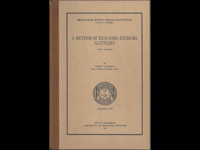 Robert Goddard, an American physicist and rocket pioneer, was born Oct. 5, 1882. While teaching at Clark University in Massachusetts, he wrote and published A Method of Reaching Extreme Altitudes (1919), a 69-page treatise that explained how to launch a two-stage solid-propellant rocket into the upper atmosphere, and, in a brief appendix, how it might be possible to send a rocket to the moon (see second image above). This is probably THE seminal document in the history of American space flight, even though it was written before Goddard had had much success in actually launching rockets. We have a copy in our History of Science Collection.