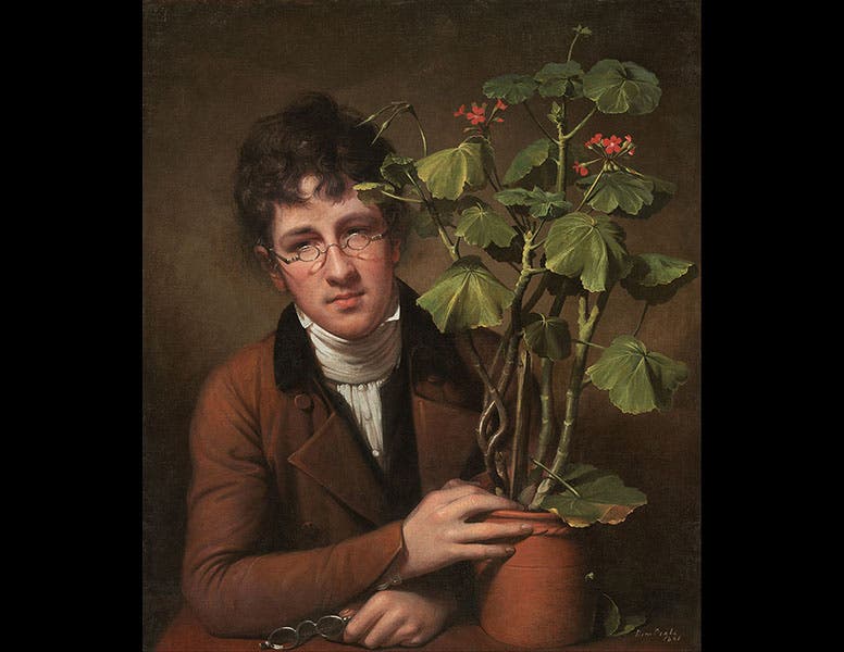 Rubens Peale, an American painter and museum administrator, was born May 4, 1784. Rubens was the son of Charles Willson Peale, the noted portrait painter, naturalist, and founder of Philadelphia's Peale Museum. His two older brothers, Raphaelle and Rembrandt, were accomplished artists, as was the much younger fourth brother, Titian, who was an explorer as well. Rubens was the odd duck in this famous filial foursome, and you can see why if you look at a portrait of Rubens by Rembrandt, painted in 1801 (first image). Take your eyes off the geranium for a moment and look at what is perched upon Rubens' nose. Glasses were so cumbersome and awkward in the late 18th century that no one wore them unless they really could not see without them. It was Rubens’ poor eyesight that prevented him from following in his father's and brothers' footsteps as a portrait painter.