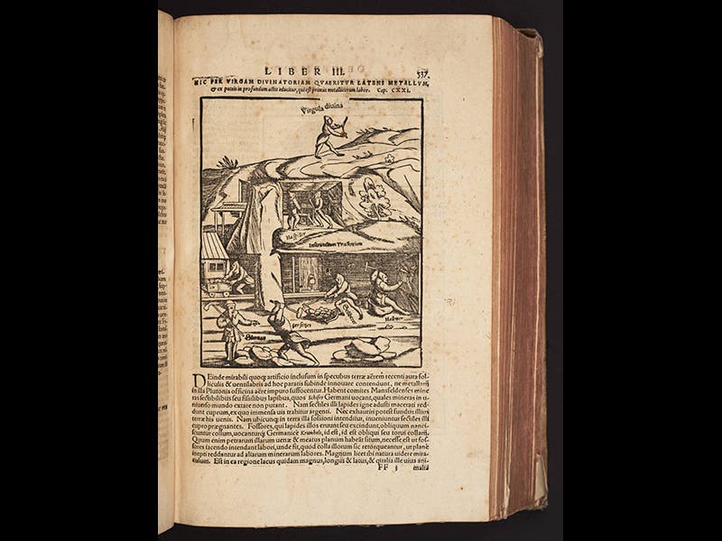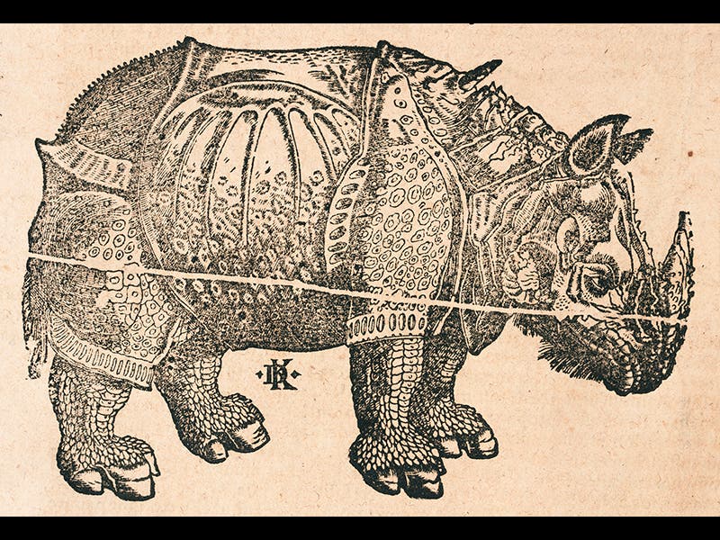 Our copy has hundreds of woodcuts: country maps, city views, portraits of historical figures, battle scenes, and exotic animals. The images above offer a selection, including a map of the New World, a view of Rome, a portrait of Erasmus, a scene of a dowser looking for metals, and a rhinoceros. You may recognize the rhino as a copy of a famous woodcut by Albrecht Dürer (1515). In early editions of the Cosmographia, the rhinoceros woodblock was intact, but somewhere along the line it developed a major crack. This was often the fate of woodblocks used again and again for works issued in multiple editions.