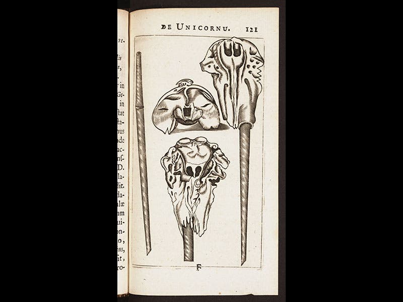 Thomas Bartholin, a Danish physician and naturalist, was born Oct. 20, 1616. Thomas was part of a distinguished family of physicians, including Caspar senior (Thomas's father), and Caspar and Thomas junior (Thomas's sons). Thomas is best known for being the first to write a description of the lymphatic system, but today we feature a rather different kind of book that Thomas first published in 1645, and then reissued, greatly enlarged with the help of his son Caspar, in 1678. The second edition, which we have in our collections, was called De unicornu observationes novae--New Observations about the Unicorn. The book takes a thorough look at all manner of horned animals, indeed at horns of any kind, with a focus on the fabled unicorn. Bartholin is not the first to argue that the unicorn horns that adorned many collections of curiosities were in fact the tusks of Arctic whales called narwhals, but it was his argument, and his picture (second image) that effectively brought the unicorn legend to an end.
