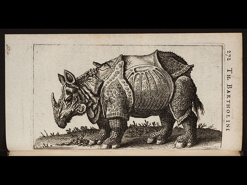 Thomas included a discussion of the rhinoceros, accounts of which might have contributed to the unicorn legend, and this gave him an opportunity to reproduce Albrecht Dürer’s well-known woodcut of the Indian rhinoceros—still reigning supreme in zoological literature even after 160 years (first image). Bartholin also provided the reader with a large fold-out engraving of the Horn of Gallehus, a fifth-century artifact crafted of pure gold that had been found in Denmark in 1639 (third image). We are fortunate to have this visual record, since the horn (and a second found in 1734 at the same location) exist no more, having been stolen from the Copenhagen Kunstkammer in 1802 and melted down.