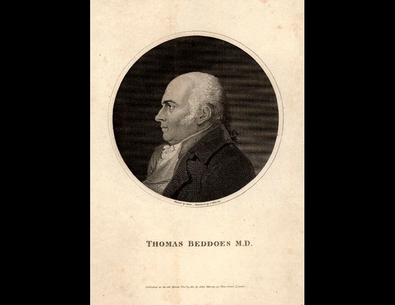 His teacher Black had discovered carbon dioxide, and Beddoes thought that other newly discovered gases--oxygen, hydrogen, nitrogen--might be useful for medical treatment, especially for diseases that affected the lungs. In the 1790s, he labored to establish a Pneumatic Institution in Bristol, where there were already many hospices for victims of consumption (tuberculosis). Beddoes got financial backing from a variety of supporters, such as the James Watt family, the Josiah Wedgwood family, and from Black himself, but he could get no support from Sir Joseph Banks and the Royal Society, primarily because he was considered a "Jacobin", overly sympathetic to the causes of the French Revolution. This was just after a mob in Birmingham had burned the home and laboratory of Joseph Priestley, another chemist and sympathizer of French democratic ideals. Nevertheless, the Pneumatic Institution finally got underway in 1799, and Beddoes was fortunate in his choice of medical superintendent--a very young Humphry Davy. It was there that Davy did his first experiments with nitrous oxide, which he would make famous as "laughing gas." The Pneumatic Institution operated only for about five years--oxygen therapy provided temporary well-being, but no cures--and Davy moved on to the Royal Institution in London. Around 1804, the Pneumatic Institution changed to become a hospital for the poor, which Beddoes operated until 1808; he passed away in December of that year. The financial backers for all of this deserve a great deal of credit, for the Pneumatic Institution was not a paying concern; Beddoes never charged his patients a fee.