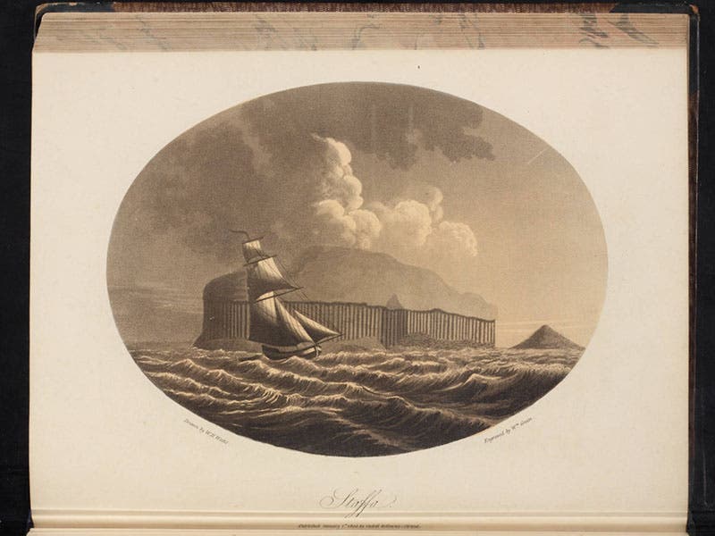 Thomas Garnett, a Scottish chemist and geologist, was born Apr. 21, 1766. He studied chemistry under Joseph Black at Edinburgh, and then taught for a short time at the newly-founded Royal Institution in London, before his early death, at age 36, in 1802. He is best remembered for a travel book he wrote, Observations on a Tour through the Highlands and Part of the Western Isles of Scotland (1800). At the time, there was a controversy swirling among geologists, as to whether basalt was a volcanic or a sedimentary rock. Scotland is full of varieties of basalt, which the Scots call “whinstone”, and Garnett seems to have visited all the important whinstone locations, such as Fingal’s Cave in the Hebrides (first image above, with detail following), which sits on the Isle of Staffa (third image), illustrating many of these with charming aquatints in his book (and including the famous Loch Lomond, fourth image).