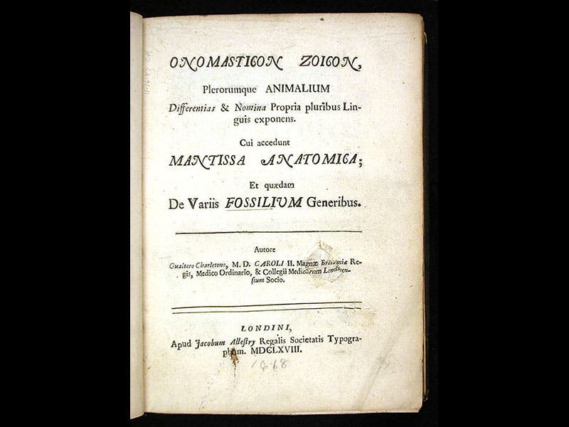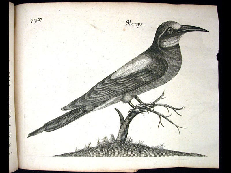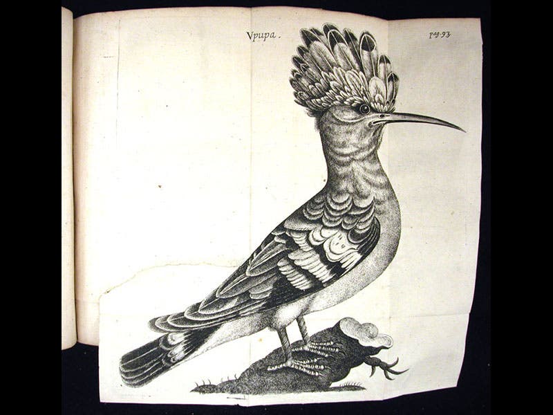 Walter Charleton, an English natural philosopher, was born Feb. 13, 1619. Charleton is best known for being the avenue by which atomism entered England from continental philosophy, as his Physiologia Epicuro-Gassendo-Charletonia (1654) introduced Gassendi and Epicurean atomism into Great Britain. But Charleton also wrote a much briefer work on natural history, Onomasticon Zoicon (1668, fourth image), that we are going to feature today. Here Charleton discusses a variety of animals and birds, but illustrates only a few, such as the bee-eater, hoopoe, and crossbill that we see above (in that order). What is interesting about the engravings is the way Charleton attempts to guarantee their veracity by giving details of their production. Concerning the bee-eater (Merops, first image), Charleton says he was given the specimen from Italy, and he had commissioned an effigy from an engraver, “so that it seems to be a true bird and not an engraved copy." As to the hoopoe (Upupa, second image), he points out that the specimen "was killed last winter ten miles from London and given to me; I have added his effigy, by a very skilled sculptor." This is a new thing in natural history illustration, depicting specific individual birds; earlier natural histories, when they depicted an animal or bird, used generic illustrations, which were often borrowed from earlier works. Charleton wants you to know that this is not any hoopoe or any beeater--these are the very specimens that he caught and studied, and the pictures are as true to life as his artists could make them. The Royal Society at the time was very concerned with the problem of verification when describing the results of experiments, and they took great pains to secure witnesses for their experiments. It would seem that Charleton was attempting to extend this verification process to the study of nature.