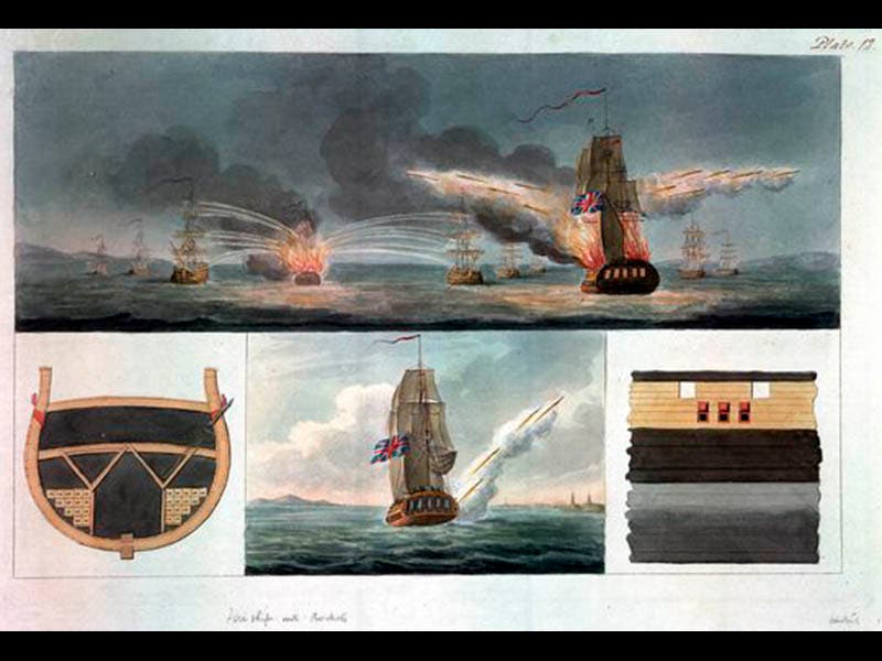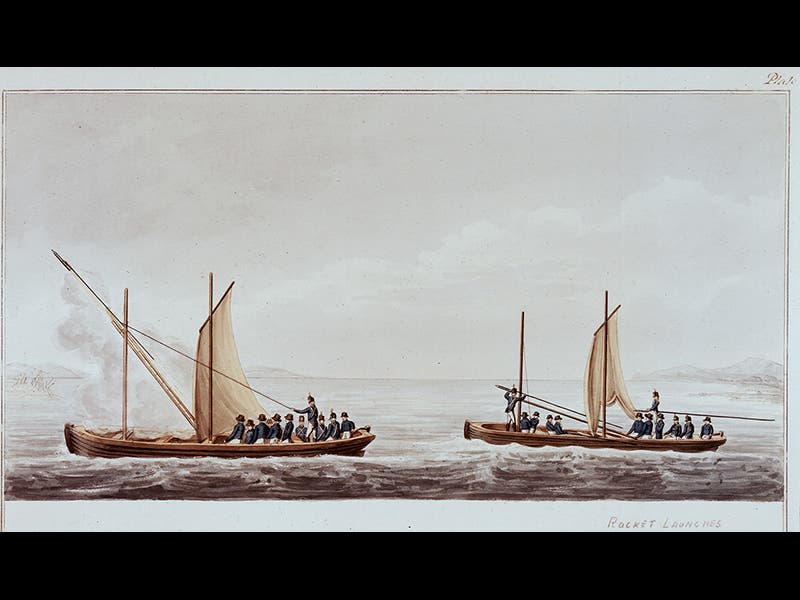 Sir William Congreve, an English inventor, was born May 20, 1772. His father, also Sir William, was in charge of the Woolwich Royal Laboratory, where he worked, apparently quite successfully, to improve the ordnance of the Royal Artillery, mainly by developing better gunpowder. Son William, after failing as a newspaper publisher, decided around 1804 to see if he could improve the rocket and add it to the arsenal of the British artillery. Rockets had long been used in China and India, and the Indian army had employed them effectively against the British army in recent skirmishes. A number of these Indian rockets were brought back to Woolwich and provided the foundation for Congreve's own work. It is not clear what, if anything, Congreve did to improve the Indian models, except in persuading the military that they were worth trying against the French, and by writing a number of books in which he pretended that India and China had made no improvements whatsoever to the science of rocketry. A Congreve rocket, as it came to be called, consisted of an iron head packed with gunpowder, and a long stabilizing pole that kept it from tumbling in flight. There is a watercolor in the National Maritime Museum in Greenwich, supposedly by Congreve himself, that shows the testing of his rockets in small vessels (first image above) and another depicting his rockets being used in battle (second image). The advantage of rockets over mortars, to the Navy, was that, since rockets had no recoil, you could fire them by the hundreds from below-decks, whereas mortars (and cannons) required elaborate ordnance to absorb the shock of recoil, and you could only fire so many without sending the ship ballast over bilge water. The disadvantage of rockets (at least the Congreve rockets) is that they were almost impossible to aim with precision, so you had to fire quite a number to have a chance of hitting anything. Probably the most memorable achievement of the Congreve rocket system occurred in the late stages of the War of 1812, during the British attack on Fort McHenry in 1814, when the “red glare" of the Congreve rockets being fired from the HMS Erebus made a distinct impression on Francis Scott Key as he was jotting down possible verses for his poem, “The Defence of Fort M’Henry”, which would soon morph into “The Star-Spangled Banner.” It is interesting that the most famous illustration of the Battle of Fort McHenry, a print by J. Bower of 1816, shows a rain of mortars (“the bombs bursting in air”), with nary a rocket in sight (third image). It is a good thing that Francis Scott Key was more impressed with Congreve’s rockets than Bower was, or else our national anthem would have had a serious hole right in the middle of the first stanza. A fine portrait of Congreve, by James Lonsdale, hangs in the National Portrait Gallery in London (fourth image). Dr. William B. Ashworth, Jr., Consultant for the History of Science, Linda Hall Library and Associate Professor, Department of History, University of Missouri-Kansas City. Comments or corrections are welcome; please direct to ashworthw@umkc.edu.