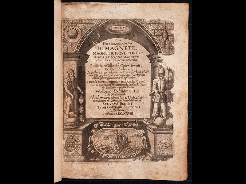 The title page of the first edition of De magnete is plain letterpress (second image), but the second edition added an engraved title page, and supposedly, that is William Gilbert himself, standing at the left, holding a string of three lodestones (sixth image).