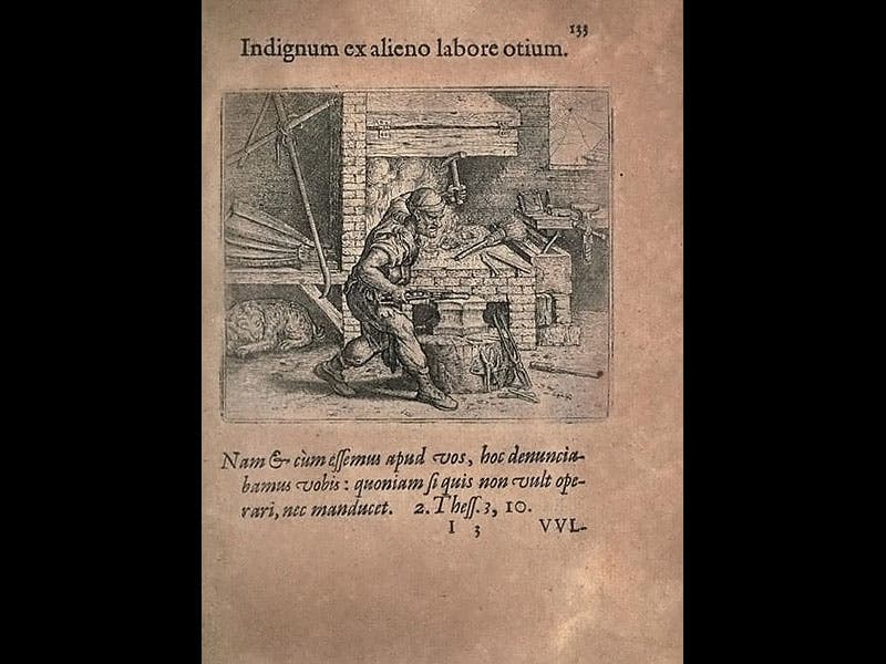 The most often reproduced illustration in De magnete is "The Forger," showing a blacksmith pounding a bar of hot iron aligned with the earth's magnetic poles, which would magnetize the bar (first image). The forger is a rather refined, upper-middle class blacksmith in a rather tidy smithy. Oddly, as the book went through later editions, the blacksmith underwent a social regression. It is not so noticeable in the second edition, published in Stettin in 1628 (third image), but it certainly is by the third edition of 1633, also published in Stettin (fourth image), where the blacksmith has exchanged his fedora for a do-rag and has acquired a dog, making him resemble the forger in the Aesopian fable, "The blacksmith and the dog." Which, it turns out, is exactly where Gilbert's woodcut originated, from an etching in a 1579 edition of Aesop's fables (fifth image). Why it was cleaned up for the first edition, and allowed to relapse for the second and third, is a mystery. It is a mostly unnoticed reversion, since very few libraries have all three early editions of Gilbert's book. We are pleased to be in that small number.